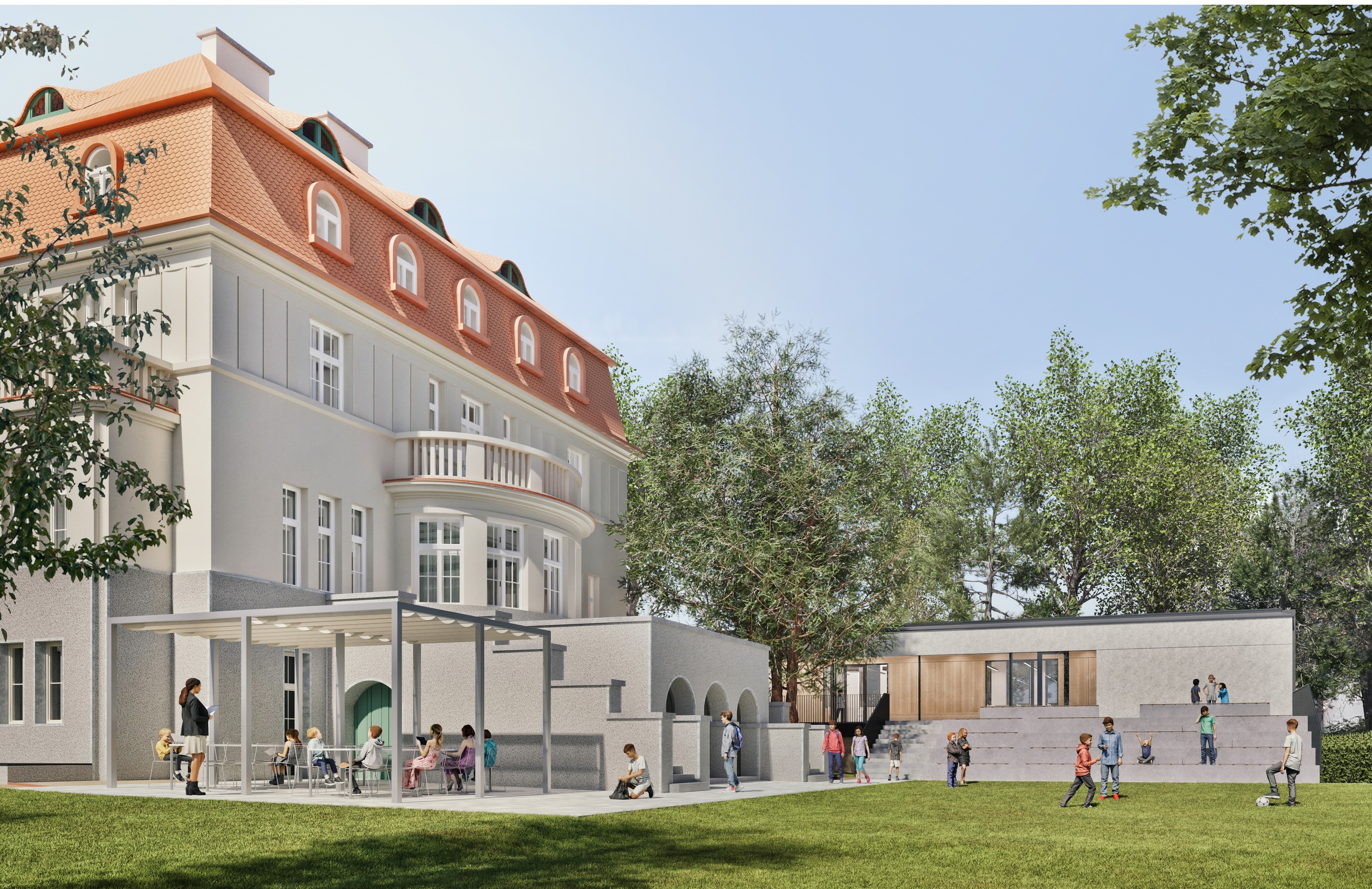 Základní a střední škola budou sídlit v našem novém kampusu v Praze Bubenči. Základní škola se do nového kampusu přesune od září 2026. Střední školu zde otevřeme v září 2029.